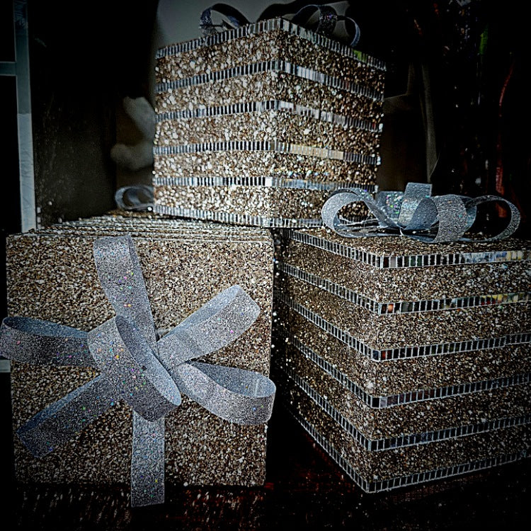 15 cm cubes of glittery gold and silver stripes topped with bows!