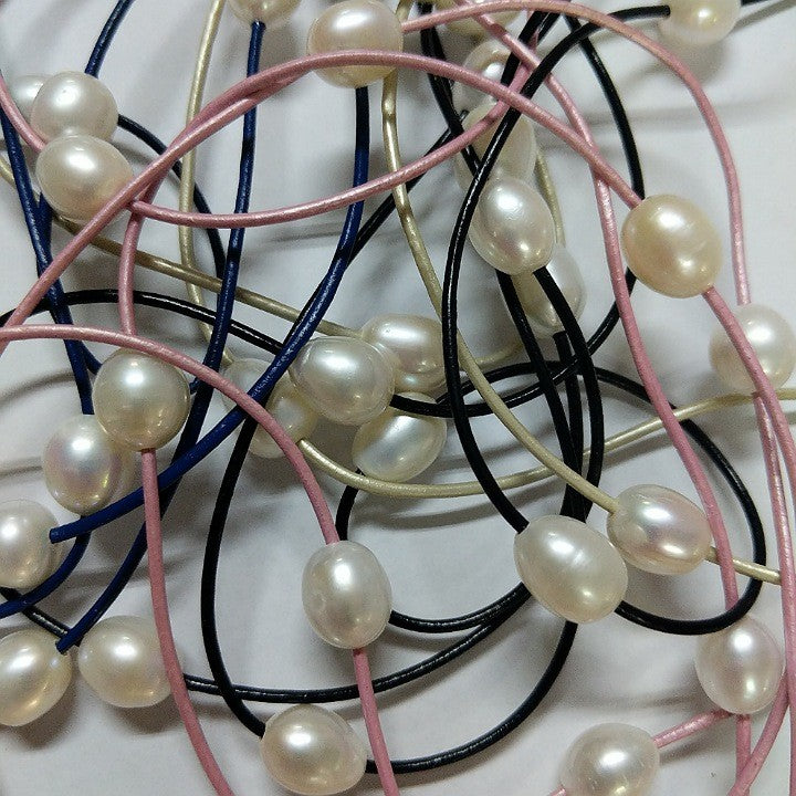 140 cm long strand of coloured leather interspersed with 15 approximately 1 cm freshwater egg pearls makes a stylish necklace for casual wear or double it to dress it up.